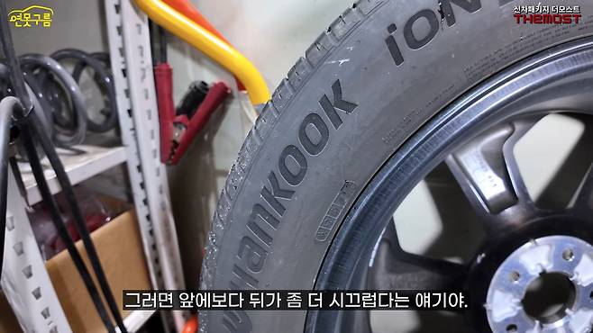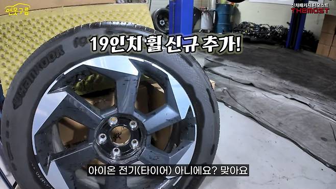 이전까지는 18인치 휠만 적용되었었죠. 국산 타이어인 아이온 에보 AS 올 시즌 타이어가 적용되었는데, 이 타이어의 성능도 괜찮았고 특히 조용하다는 점이 인상 깊었습니다. 전기차 전용 타이어들은 기본적으로 정숙성이 뛰어나다는 장점을 가지고 있습니다. EV 모드 시의 정숙한 주행감을 위해 전기차 타이어를 사용하는 것이죠. 타이어 측면에 '사운드 어쿠스틱'이라는 문구가 보이는데, 이는 흡음 타이어임을 의미하며, 이 역시 조용한 주행에 기여합니다.