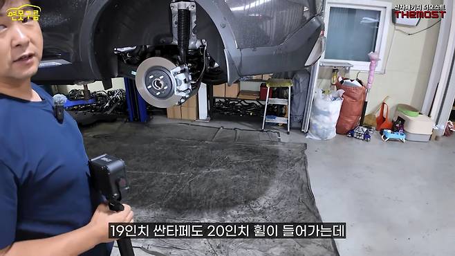 이제 쏘렌토에서도 19인치 휠을 선택할 수 있게 된 것입니다. 싼타페는 20인치 휠이 들어가며 금호 타이어를 사용하는 등 타이어 제조사에서도 차이가 나는 것을 볼 수 있습니다. 이제 차량 하부를 좀 더 깊이 있게 살펴보겠습니다. 쏘렌토는 출시된 지 4년이 된 차량이지만, 현대기아차는 플랫폼을 공유하기 때문에 대부분의 차량 하부 구조가 유사합니다. 앞서 언급했듯이, 3세대 플랫폼은 스몰 오버랩 충돌에 대응하기 위해 적용되었습니다.
