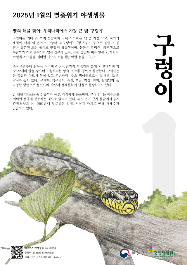 '푸른 뱀'의 해인 2025년을 맞아 1월 '이달의 멸종위기 야생생물'로 구렁이가 선정됐다.