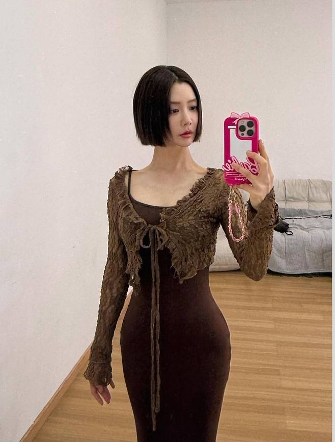 첫 번째 룩에서는 초밀착 시스루 브라운 레이스 크롭 카디건과 슬립 원피스로 섹시하면서도 소프트한 무드를 선보였습니다.