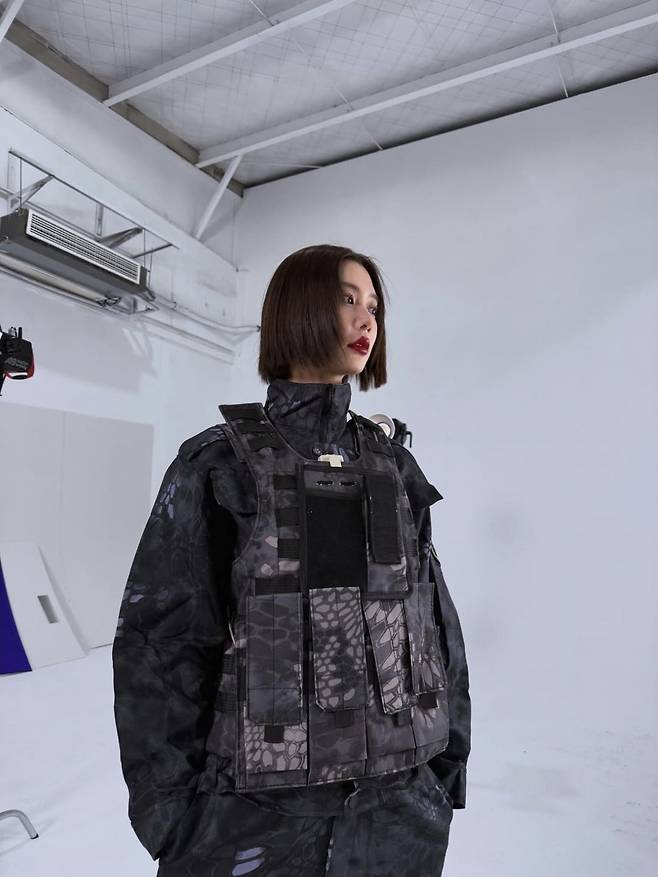 두 번째 룩에서는 밀리터리 스타일 방탄조끼와 카무플라주 셋업으로 전사미 넘치는 걸크러쉬 비주얼을 보였습니다.