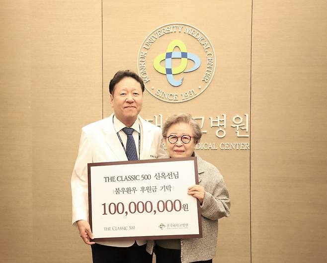 미래형 복합문화 주거공간 ‘더 클래식 500’의 입소자인 신옥선 회원이 불우환우 후원금 1억 원을 건국대병원에 기탁했다.
