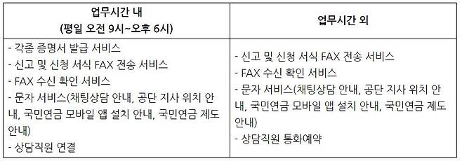 국민연금 고객센터 운영시간은 평일 오전 9시부터 오후 6시까지인데요! 업무시간 외에도 ARS를 통한 셀프서비스 이용이 가능합니다,(일부 서비스 제외) 자세한 내용은 아래 표를 참고해주세요:)