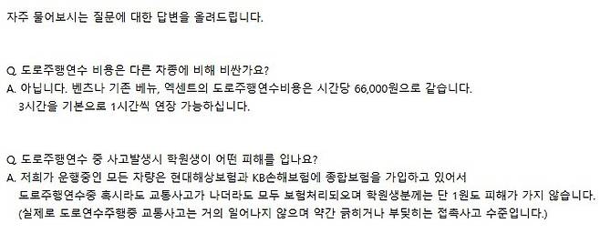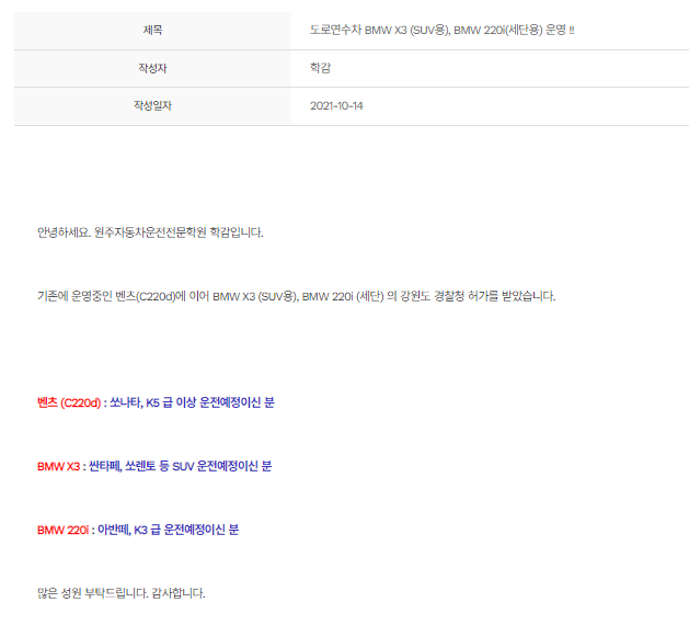 원주의 어느 자동차 면허 학원의 도로 연수차 클라스