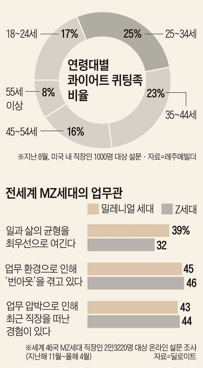 최근 콰이어트 퀴팅이 주목받는 이유는 코로나 팬데믹 이후 이런 경향이 실제로 두드러지게 나타나고 있기 때문이다. 글로벌 리서치 업체 갤럽이 지난 6월 미국 직장인 1만5091명을 대상으로 진행한 설문에서 응답자 절반은 자신이 맡은 업무 중 최소한만 소화한다고 답했다. 미 구인 사이트 ‘레주메 빌더’가 실시한 최근 조사에서도 25~34세 근로자의 4분의 1이 콰이어트 퀴팅족임을 인정했을 정도다. 팬데믹 이후 중국 Z세대를 중심으로 유행하는 탕핑(躺平)주의도 일종의 콰이어트 퀴팅으로 여겨진다. ‘쓸데없이 노력하지 말고 최소한의 생계만 유지하자’는 생활 방식이다.