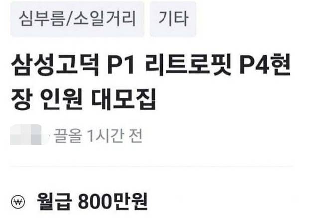 지난 13일 한 온라인커뮤니티에는 “월 800백만 원 당근 알바”라는 제목의 글이 게재됐다. 글쓴이는 한 사진을 첨부했는데, 사진에는 ‘P4 현장 인원 대모집’이라는 직원 모집 공고 내용이 담겼다.