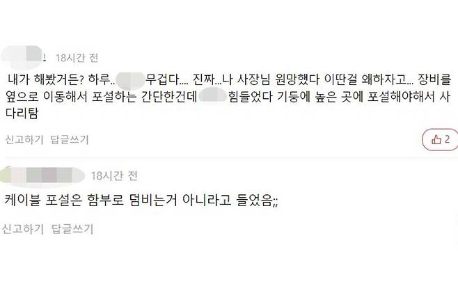 종류에 따라 케이블 무게가 천차만별인 만큼 해당 업무를 경험한 한 네티즌은 “내가 하루 해봤는데, 정말 무겁다”라며 “이딴 걸 왜 하자고 했는지 사장님을 원망했다. 장비를 옆으로 이동해서 포설하는 간단한 건데도 정말 힘들었다”라고 했다.