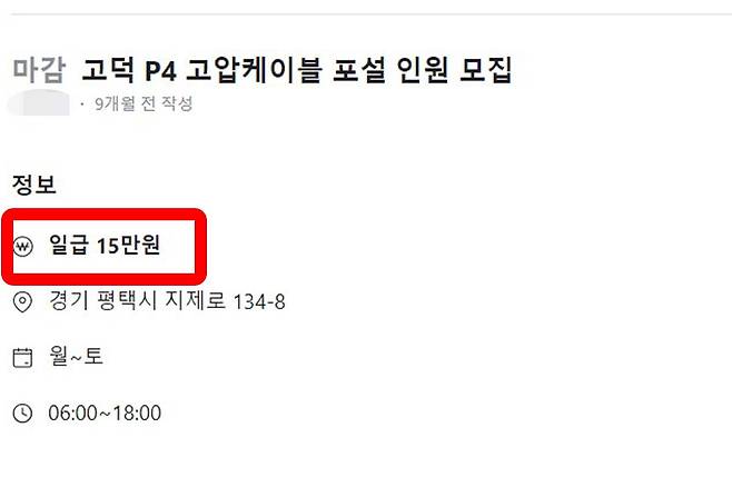 주휴수당을 비롯해 휴일근로 수당, 4대 보험, 퇴직금 제공, 연차, 식사 제공, 휴식 시간 보장 등을 제시하면서 고압 케이블 포설 인원을 모집했다. 케이블 포설이란 케이블을 지하관로, 해저, 벽체 등에 추가하여 설치하는 것으로 공사 현장에서 도면에 따라 작업이 진행된다.
