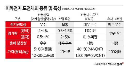 CNT는 카본블랙 대비 적은 양을 도전재로 사용할 수 있다. 그만큼 활물질을 추가로 넣을 수 있어 전지 성능을 높일 수 있다. 값비싼 바인더의 사용량을 줄일 수 있다는 점도 장점이다.