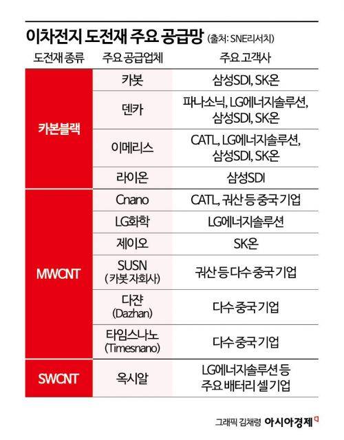 카본블랙은 미국의 캐봇(Cabot), 일본의 덴카(Denka)와 라이온(Lion), 스위스 이메리스(Imeys)가 주요 공급사다.