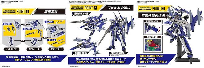 -일부에 교체 파트를 사용해 변형 시퀀스를 간략화하는 [교환식 삼단 변형(숏컷 체인치)]를 채용했습니다. HG 시리즈만의 쉬운 조립성과 폭넓은 가동범위, 각 변형 시의 세련된 프로포션을 실현했습니다.