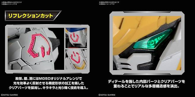 -가슴, 무릎, 어깨에는 MGSD의 오리지널 어레인지로, 빛을 높은 효율로 반사시키는 정밀 형상 가공을 한 클리어 파츠를 채용, 반짝반짝 빛나는 기술을 도입했습니다.