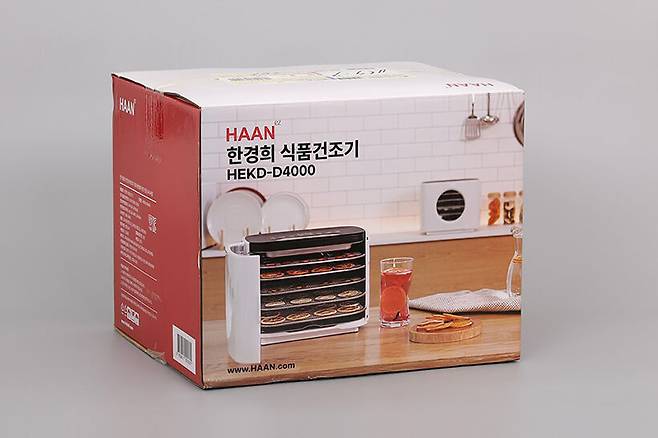 한경희 식품건조기 HEKD-D4000은 풀컬러로 인쇄된 박스에 담겨 있다. 박스 앞면에는 제품의 외형과 사용법을 가늠할 수 있는 활용컷이 인쇄되어 있으며, 제품 사양도 자세하게 설명하고 있다.