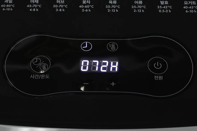 식재료를 넣고 전원을 연결했다면 이제 설정만 해주면 된다. 우선 전원 버튼을 누르면 디스플레이가 켜지는데, 왼쪽의 시간/온도 버튼을 누를 때마다 디스플레이가 시간과 온도로 전환된다. 설정은 디스플레이 바로 아래에 있는 +/- 버튼을 누르면 되는데, 시간은 1시간부터 최대 72시간까지 설정 가능하고, 온도는 최저 35℃부터 최고 80℃까지 설정할 수 있다.
