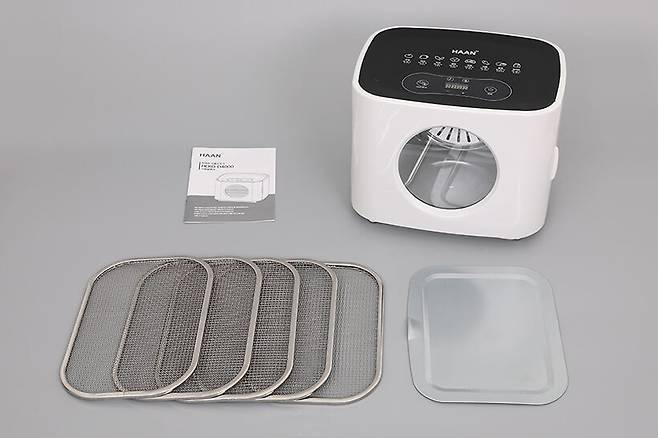 구성품으로는 한경희 식품건조기 HEKD-D4000 본체와 철망으로 된 스테인리스 건조 트레이 5개, 드롭 트레이 1개, 그리고 사용 설명서가 기본 제공된다.