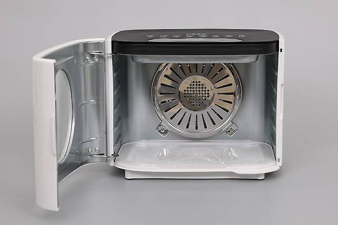 한경희 식품건조기 HEKD-D4000의 전면부 도어를 열면 내부를 확인할 수 있다. 내부는 바닥 면을 제외하고 전부 금속으로 되어 있으며, 뒷면에는 열풍이 나오는 송풍구가 있다.