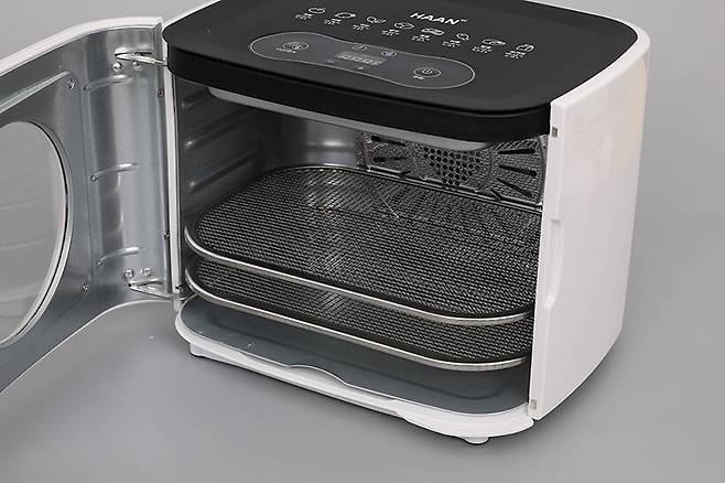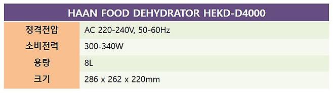 한경희 식품건조기 HEKD-D4000은 심플한 디자인에 콤팩트한 크기로 주방에 두고 사용하기에 부담이 없다. 또한 직관적인 버튼 방식 설정으로 사용이 간편하며, 내부에 스테인리스 5엽 날개가 회전해 내부 전체에 열풍이 순환되는 방식을 채택해 제일 윗단부터 제일 아랫단까지 전체가 동일하게 건조된다. 또한 사용 완료 후에는 내부의 온도를 빠르게 낮춰주는 자동 쿨다운 모드가 작동해 사용자의 안전까지 생각했다. 그뿐만 아니라 음식이 닿는 트레이나 내부는 모두 SUS304 스테인리스 소재를 사용해 환경 호르몬이나 냄새 걱정이 없다는 점도 빼놓을 수 없는 장점이라고 할 수 있다.