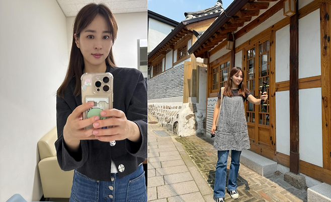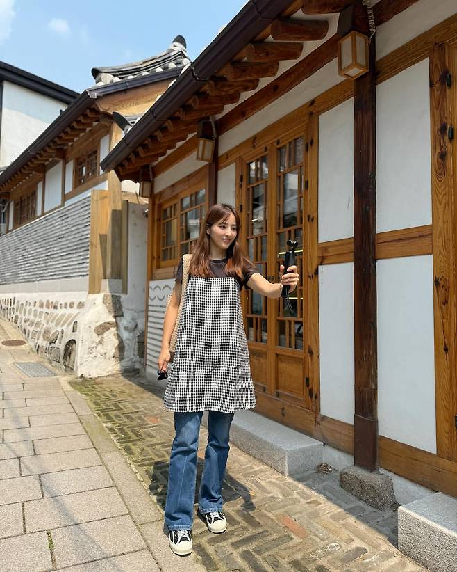 전통 한옥 거리에서 한혜진은 소매가 짧은 블랙 티셔츠 위에 체크 패턴의 민소매 원피스를 레이어드했다. 여기에 와이드한 데님 팬츠와 블랙 스니커즈를 더해 활동적이고 트렌디한 스트리트 캐주얼룩을 완성했다. 체크 원피스의 귀여움과 데님의 캐주얼함이 조화를 이루며, 셀카봉을 활용한 자연스러운 포즈가 눈길을 끈다.
