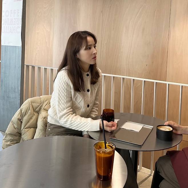 한혜진은 케이블 짜임이 돋보이는 아이보리 컬러의 니트 가디건을 선택해 포근한 무드를 연출했다. 큼직한 버튼 디테일이 포인트가 되며, 차분한 베이지 계열의 팬츠와 매치해 부드럽고 내추럴한 분위기를 완성했다. 어깨에 걸친 라이트 베이지 패딩은 실용성과 스타일을 동시에 잡은 선택이다. 전체적으로 심플하면서도 세련된 겨울철 카페룩의 정석을 보여준다.