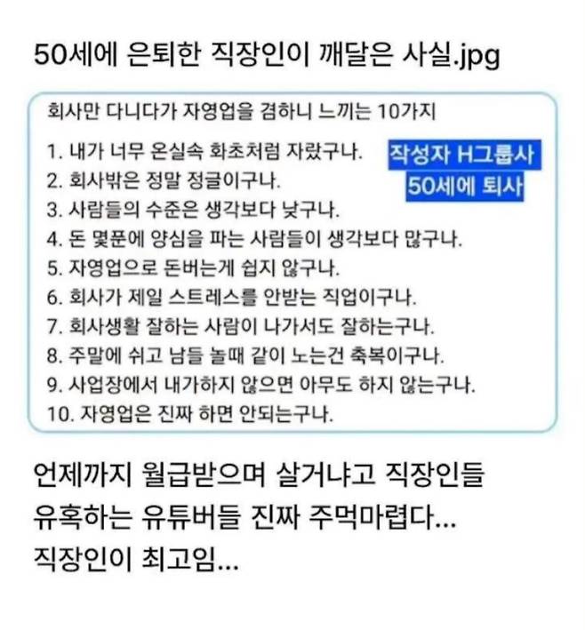 대기업 다니다가 50세 은퇴하고 자영업하고 느낀점 10가지