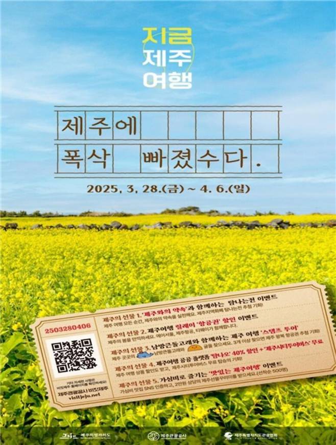 제주도는 18일, 오는 28일부터 4월 6일까지 10일 동안 특별 여행주간 ‘2025 지금, 제주여행-제주에 폭삭 빠졌수다’를 운영한다고 밝혔다.