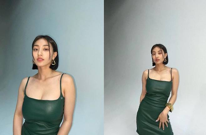 사진 속 지효는 레더 원피스를 차려입고 포즈를 취한 모습이다.
