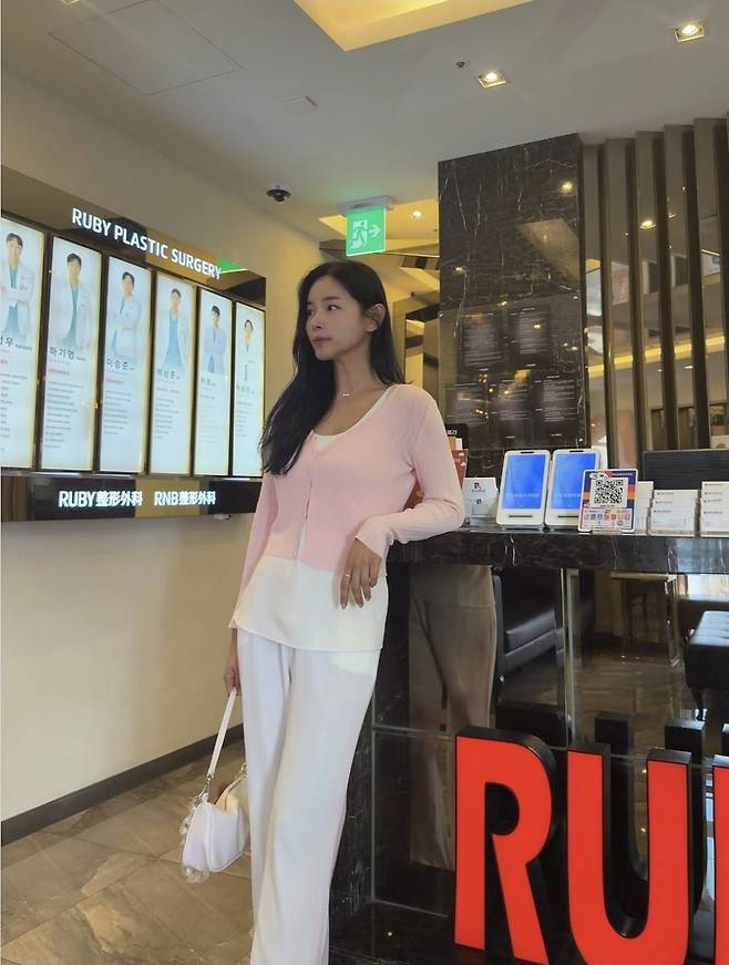은은한 파스텔 핑크 컬러의 얇은 니트 카디건에 화이트 이너를 레이어드해 부드러운 여성미를 강조했습니다.