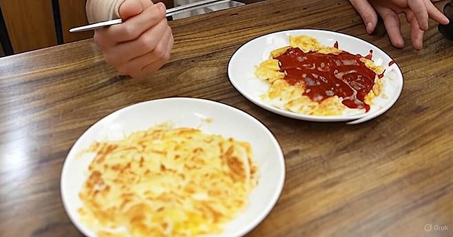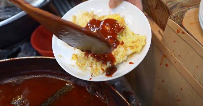 반죽을 부은 뒤 가장자리가 익으면 반으로 접어 앞뒤로 노릇하게 굽는다. 이 과정은 마치 오믈렛을 만드는 듯 보이지만, 결과물은 쫄깃한 당면과 고소한 계란의 독특한 식감을 자랑한다.