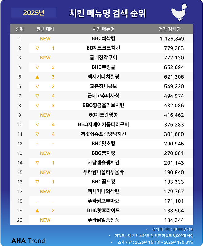 굽네치킨에서 새롭게 선보인 ‘장각구이’는 3위에 올랐으며, 그 외 60계 ‘쯔란윙봉’, BBQ ‘뿜치킹’, 푸라닭 ‘나폴리투움바’, ‘일품깐풍’, 멕시카나치킨의 ‘와삭칸’까지 2025년에 새롭게 출시된 메뉴 7개가 상위 20위에 포함됐다.