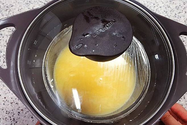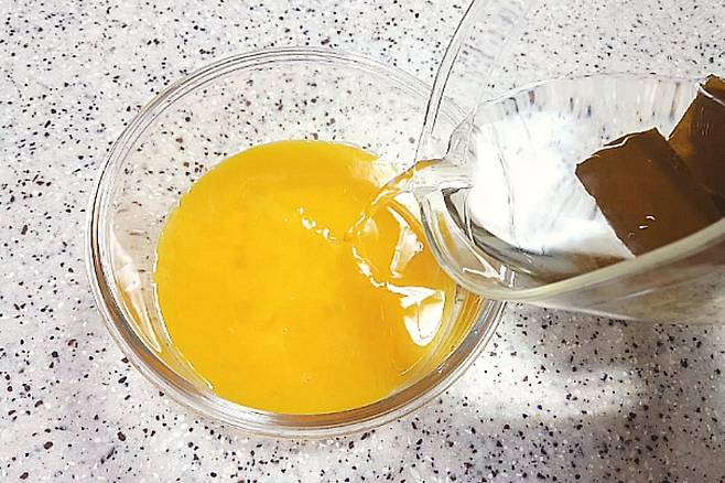 걸러낸 계란물에 다시마 우려낸 물을 부어서 잘 섞어주세요.