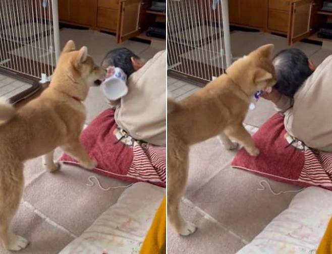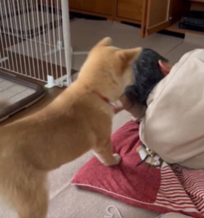 공개된 영상 속에서 강아지는 무슨 영문인지 알 수는 없지만 바닥에 옆으로 기대어 누워 있는 아빠의 뒷머리를 자꾸 핥으려고 했는데요.
