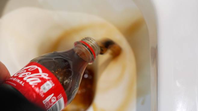 마지막은 바로 변기 청소인데요. 화장실 변기 곳곳에 콜라를 부어 주세요.