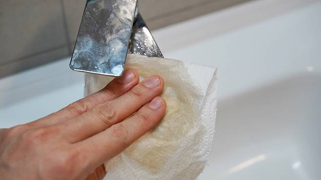 그러면 수도꼭지에 있던 물때가 온데간데없이 사라지고, 반짝반짝 해진 모습만 남게 된답니다.