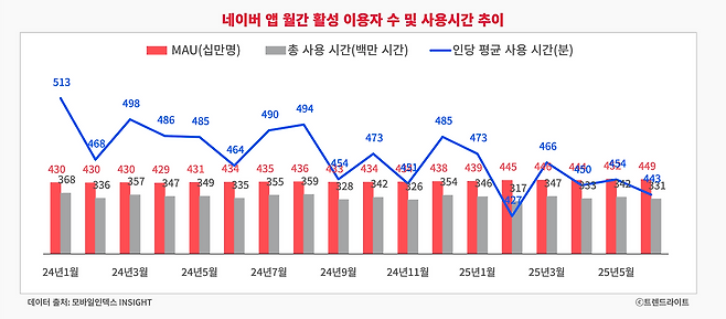 하지만 지금은 상황이 달라졌습니다. 쇼핑의 중심축이 웹에서 앱으로 옮겨가며, 네이버를 거치지 않고 구매가 이루어지는 비중이 커졌습니다. 그만큼 네이버 가격비교의 영향력도 약해졌고요. 더 나아가, 네이버라는 플랫폼 자체의 힘도 점차 약해지고 있습니다. 여전히 사용자 수는 전 국민 모두라고 해도 무방할 정도로 많지만, 이들이 네이버에 머무르는 시간은 줄고 있거든요. 총 사용시간과 인당 평균 사용시간 지표가 모두 흔들리고 있다는 게 이를 보여주죠.