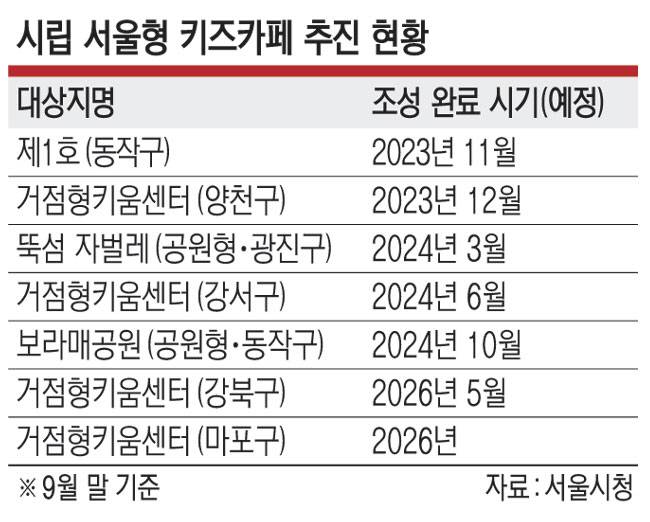 시도 이러한 어려움을 알고 올해까지 100개소, 2026년까지 400개소의 서울형 키즈카페를 여는 걸 목표로 달리고 있다. 현재 구립 서울형 키즈카페는 12개소가 개관했고, 67개소가 조성 중이다. 시립은 이곳 제1호를 포함해 총 7개소를 만들 예정이다. 시립은 다양한 신규 프로그램을 개발·적용하는 서울형 키즈카페의 ‘테스트베드’ 역할을 할 예정이다. 특히 초등돌봄시설인 강북·강서·마포·양천 거점형키움센터에 조성되는 시립은 돌봄(키움센터)과 놀이(키즈카페)를 결합한 새로운 아동복지시설이 될 것으로 기대된다. 뚝섬 자벌레와 보라매공원에는 공원형 시립으로서 실내·외 다양한 놀이가 연계될 수 있도록 구성할 계획이다. 시는 민관 협력을 위해 ‘서울형키즈카페머니’도 발급하고 있다. 서울페이플러스(Pay+) 앱 등을 통해 20% 할인된 해당 상품권을 구매해 시가 선정한 26개 민간 키즈카페에서 사용할 수 있다. 오세훈 서울시장은 “앞으로도 생활권에서 언제든 쉽게 이용할 수 있도록 확충해 나가겠다”고 밝혔다.