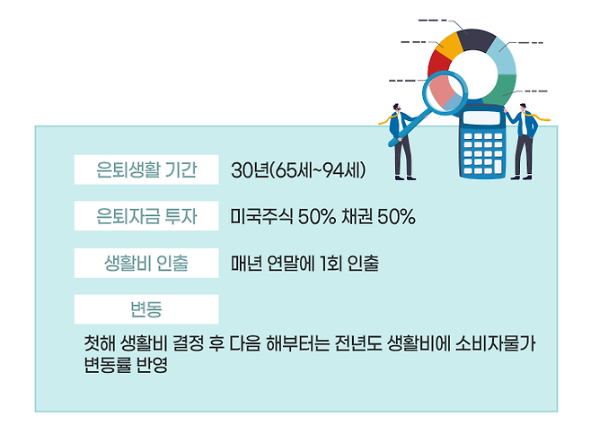 먼저 은퇴생활 기간은 30년(65세~94세)으로 잡았습니다. 당시로는 매우 보수적으로 은퇴 기간을 잡은 셈입니다. 그리고 은퇴자금은 미국 주식과 채권에 반반씩 나눠서 투자하고, 생활비는 매년 연말에 한 번 인출하는 것으로 가정했습니다. 첫해 생활비가 결정되면 이듬해부터는 전년도 생활비에서 소비자물가 변동률에 맞춰 인출 금액을 조정하기로 합니다.