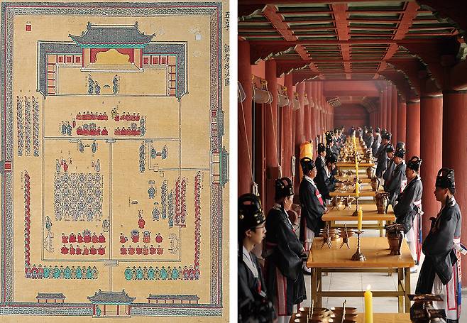‘천기위(踐其位)하여 행기례(行其禮)하며, 주기락(奏其樂)하며, 경기소존(敬其所尊)하며, 애기소친(愛其所親)하며 사사여사생(事死如事生)하며, 사망여사존(事亡如事存)이 효지지야(孝之至也)니라.’ 즉, ‘그의 자리에 올라 그가 하던 예를 행하며, 그가 즐기던 음악을 연주하며, 그가 높이던 바를 공경하고, 그가 친애하던 바를 사랑하며, 죽은 자 섬기기를 한 사람 섬기듯 하며, 없는 사람 섬기기를 살아있는 사람 섬기듯 하는 것이 효의 지극함이다.’(<중용> 19장) 월대는 제사를 위한 이동의 공간이며 또한 돌아가신 왕들이 마치 살아 있는 것처럼 평소 그들이 즐겨 듣고 보았던 춤과 음악과 노래를 제례에 펼쳐 보이는 장소이며 그리고 동쪽 단부에는 공경하고 친한 신하들이 도열해 있다. 하월대 아래에는 그 외의 문무백관들이 도열하는 장소가 된다.