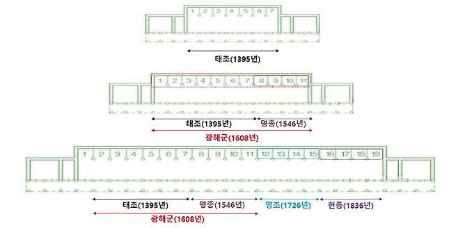종묘는 태조 4년(1395년), 정전 7칸을 시작으로 세종 3년(1421년)에 5묘제 관습에 따라 정전에서 나와야 하는 추존왕 4대의 신주를 모시기 위해 중앙 네 칸, 좌우 한 칸 협실의 별묘를 위한 영녕전을 지었다. 첫 번째 증축이 명종 원년(1546년), 네 칸을 증축하여 11칸이 되었다. 그런데 선조 25년(1592년) 임진왜란이 발발해 전소해 다시 광해군 즉위(1608년)에 원래 모습인 11칸으로 복원했다. 영조 2년(1726년)에 정전 네 칸을 증축해 15칸이 되었다. 마지막 증축은 헌종 2년(1834년) 네 칸을 확장해 19칸이 되고, 영녕전 또한 협실 다섯 칸을 확장해 15칸이 되었다. 지금 우리가 마주하는 장대한 19칸 정전의 모습은 조선이 개국하고 442년이 지난 후의 모습이라는 것을 기억해 두길 바란다.