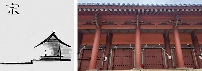 조선의 종묘처럼 긴 시간을 가지고 효의 선계(善繼)와 선술(仙術)의 개념을 답습과 반복이라는 형식으로 만들어낸 경우는 세계 건축사에서도 유래를 찾아보기 어렵다. 종묘 건축을 개념으로 형상의 원칙을 살펴보자. 첫 번째, ‘종(宗)’자를 이해하면 정전 건축을 거의 이해하는 것이라 본다. ‘종(宗)’은 ‘면(宀 : 사당의 지붕 모양)’과 ‘시(示 : 제사를 지낼 제탁의 모양)’가 합쳐진 의미인데, 신위를 모실 감실과 제사를 위한 제탁, 그리고 제사를 지낼 제관을 고려한 건축 행위 구성이라 보면 되겠다. 이 ‘종’자의 단면이 서에서 동으로 술이불작(述而不作 : 기술하되 지어내지 않는다)의 답습으로 이어져 긴 정전이 되었다. 그리고 앞서 마당 이야기에서 마당과 마루의 ‘마’가 으뜸(宗)이라 설명했다. 종묘의 형상을 ‘종(宗)’으로 한 것도 이와 같은 맥락일 것이다.