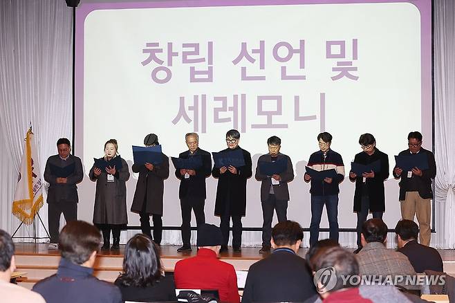 (서울=연합뉴스) 강민지 기자 = 서범강 한국웹툰산업협회 회장 등이 24일 서울 마포구 DMC타워에서 열린 만화웹툰협회총연합 발대식에서 창립 세레머니를 하고 있다. 2025.2.24