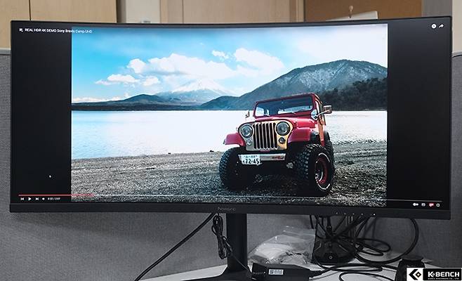 실제 비트엠 Newsync H34WQC 커브드 165 울트라게이밍 HDR으로 필자가 자주 사용하는 소니 캠프 HDR 영상을 재생하면 평균 밝기가 많이 올라갔다는 인상을 받게 된다. 부족한 밝기로 클리핑 되는 부분이 없는 건 아니지만 평균 밝기 자체가 올라간 탓에 어두운 느낌이 전혀 없고 암부와 명부의 밝기 차이도 더 명확했다.