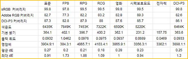 RPG나 RCG 모드는 RGB 밸런스가 좀 무너지지만 표준이나 FPS, 특히 영화 모드에선 별도 교정 없이 사용해도 충분한 수준이라서 색과 밝기에 민감한 게이머도 충분히 만족하고 사용할 만큼 높은 정확도를 제공한다.
