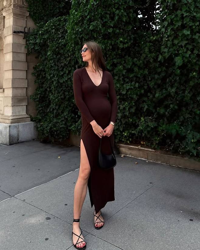 브라운 계열의 슬림 드레스는 서머 시즌에 생각보다 유용한 아이템이다. 자연광에 따라 깊이감 있는 분위기를 만들어주고, 포멀함과 캐주얼함 모두를 아우를 수 있다. 칼리처럼 심플한 샌들과 미니백만으로도 충분히 스타일리시한 하루를 만들 수 있다. 칼리 클로스처럼 도심 속 런웨이를 걷는 기분으로 스타일링에 도전해보자.