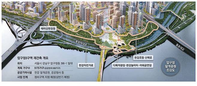 10일 서울시와 정비업계에 따르면 압구정 3구역 재건축 조합은 2만㎡(약 6000평) 규모의 '북측 덮개시설(한강 덮개공원)'이 포함된 정비계획안을 마련해 주민 공람과 강남구의회 의견 청취를 거쳐 서울시로 넘겼다.