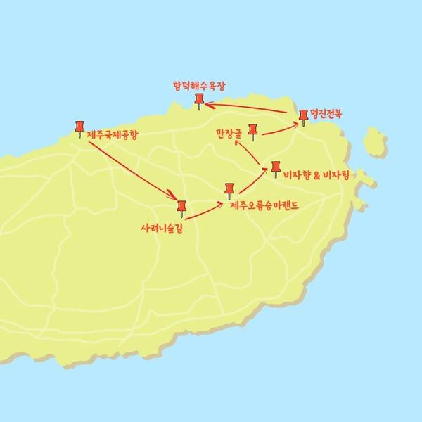 제주도의 동서쪽을 한번에 둘러볼 수 있는 코스로, 숙소는 중앙부에 위치한 제주국제공항 근처에 잡으시는 것을 추천 드립니다!