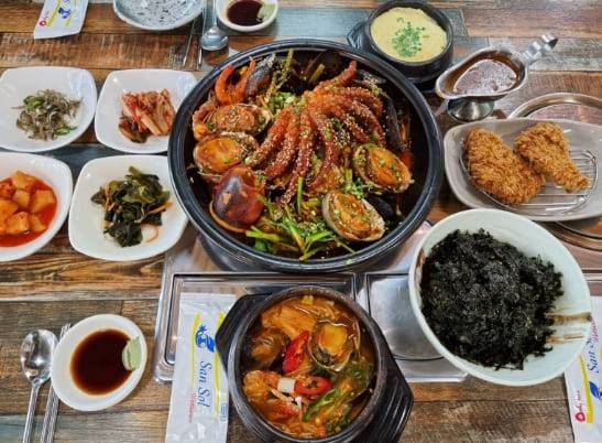 제주 갈치 구이세트, 흑돼지전복게우돌솥밥, 해물라면, 한치물회, 돔베고기 등 어르신부터 어린 아이까지 취향대로 골라서 먹을 수 있는 제주도의 다양한 음식을 판매 중입니다. 운영시간은 09:00~21:00입니다!