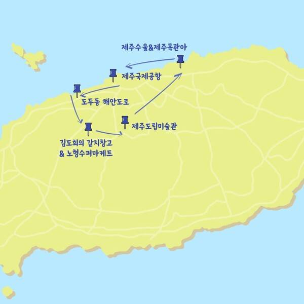 2일차 추천코스: 도두 무지개 해안도로 - 김도희의 갈치창고 - 노형수퍼마켙 - 제주특별자치도립미술관 - 제주수울 - 제주목관아