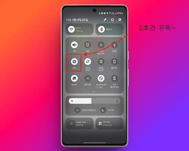 만약 교통카드가 정상적으로 등록되어 있음에도 인식이 되지 않는다면, 화면 우측 상단을 손가락으로 터치한 채 아래로 쓸어내려 빠른 설정 패널을 열어야 합니다. NFC 아이콘을 2초 이상 길게 터치하여 설정 화면으로 이동합니다.