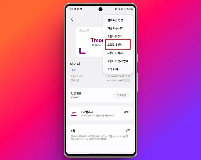 교통카드 등록 후, 우측 상단에 있는 [더 보기(⁝)] 아이콘을 터치하여 소득공제 신청을 완료하는 것이 좋습니다. 이렇게 하면 연말정산 시 교통비 소득공제를 받을 수 있어 세금 혜택을 누릴 수 있습니다.
