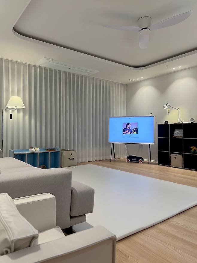 신혼부부 시절에는 거실에서 대부분의 시간을 TV를 보는데 썼지만, 지금은 아이와 가장 많이 소통하는 공간이 되었는데요. 아기와 함께 있을 때는 TV는 온전히 아기를 위한 음악을 틀어놓고 있습니다. 아직 영상은 보여주지 않고 멈춰있는 이미지에 음악만 들려주려고 해요.